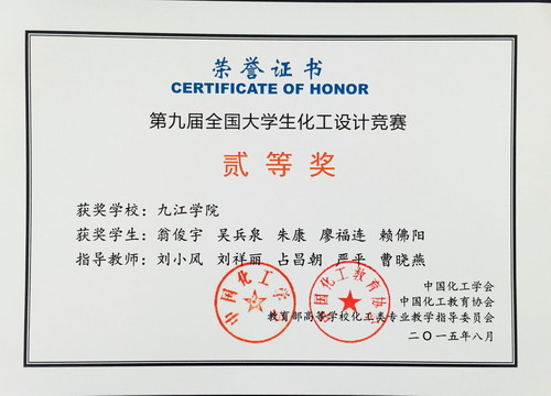 第九届全国大学生化工设计大赛决赛今年在天津大学举行,共有238所高校参加了比赛,我校代表队在刘小风、刘祥丽及占昌朝等老师的指导下荣获全国二等奖一项,成绩名列江西省各高校代表队第一。