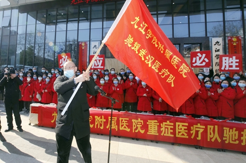 2月19日,在接到江西省卫健委支援湖北的紧急通知后,学校党委、行政高度重视,指示附属医院迅速行动,积极组建队伍、筹备物资。校党委书记赵伟、校长刘晓东、副校长杨耀防、纪委书记李广欣19日下午专程到附属医院现场部署、指导有关工作。医院广大医护人员纷纷请战,踊跃自愿报名。医院迅速组建了一支由重症医学科、呼吸科等医护人员组成的85人医疗团队。他们在简短的仪式后,随着一声“出征”号令,载着省卫健委、市委市政府、九江学院、市卫健委的殷殷嘱托,载着全市人民的牵挂与期望,紧急奔赴武汉抗疫最前线……