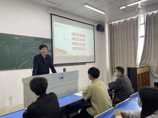 在香远楼401和216教室,赵伟分别为计算机与大数据科学学院计科A2151班和外语学院外语A2114班学生授课。他以近一段时间国际国内发生的重要事件导入,通过丰富的实例和详细的资料,围绕全国“两会”特点、全国“两会”看点、“全国“两会”要点和奋斗前行,强国有我四个部分向同学们全面介绍了2022年全国“两会”精神。他强调,全校师生要深刻理解习近平总书记提出的“五个必由之路”重大论断的丰富内涵,深刻认识到:坚持党的全面领导是坚持和发展中国特色社会主义的必由之路,中国特色社会主义是实现中华民族伟大复兴的必由之路,团结奋斗是中国人民创造历史伟业的必由之路,贯彻新发展理念是新时代我国发展壮大的必由之路,全面从严治党是党永葆生机活力、走好新的赶考之路的必由之路。要深刻理解“两个确立”的决定性意义,更加紧密地团结在以习近平同志为核心的党中央周围,把“两个确立”的政治共识转化为“两个维护”的实际行动,扎扎实实做好各项工作,在新征程上创造新辉煌。