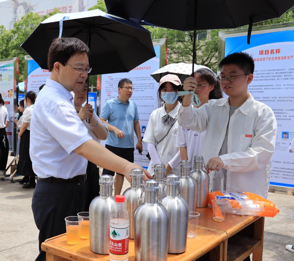 赛前,学校举行了2022年创新创业实践成果展暨项目推介会,50项总决赛参赛项目全部参展。周洛宏等总决赛评委观展并听取项目团队推介项目成果,为下午总决赛路演和答问环节提供了参考。