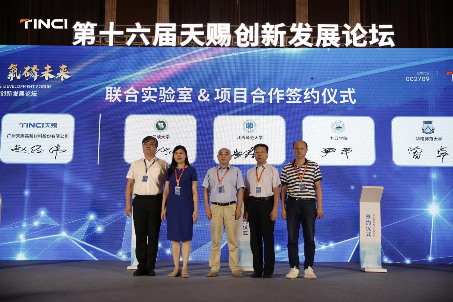 8月12日-14日,由广州天赐高新材料股份有限公司举办的第十六届天赐创新发展论坛在湖北宜昌召开。会议以“绿色低碳,氟磷未来”为主题,宜昌市、枝江市政府领导、来自于国内33所科研院所和高校的120余位专家,以及多家化工企业高管高工共计160余人参会。我校副校长严平、化学化工学院曹小华教授和王建国教授应邀参会。严平代表我校与天赐材料签订了合作协议,我校“天赐订单班”人才培养模式改革成效、江西省首批现代产业学院有机硅新材料现代产业学院建设成果等受到与会者一致好评。