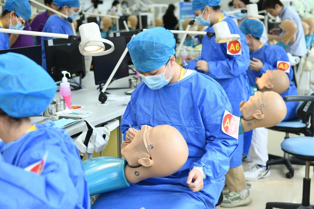 比赛精心设置了“II类洞制备术、牙槽突黏膜切口缝合术、全瓷冠牙体预备术、心肺复苏+AED急救技术”四个竞赛项目,同时结合信息化、数字化手段,应用导航式仿真训练系统、牙科仿真操作训练系统、客观化结果评估系统、无纸化考核评分系统等国内先进的教学评估手段,确保了比赛的公平性、公正性、客观性。选手们个个精神饱满,斗志昂扬,凭借扎实的理论基础、精湛的操作技艺和卓越的团队协作能力,尽现卓越风采。