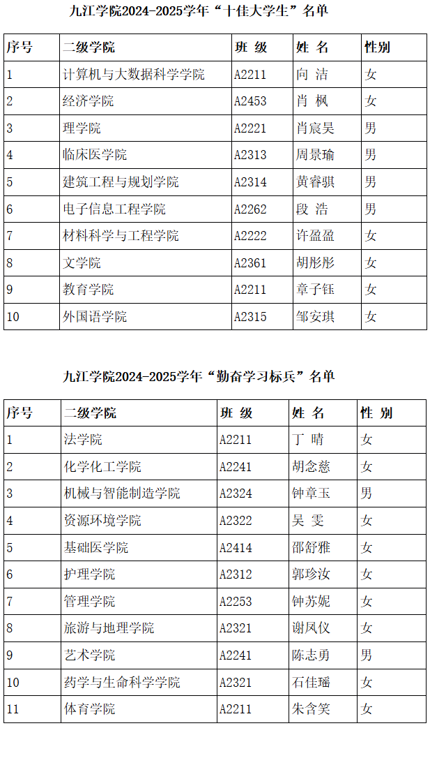 根据九江学院“十佳大学生”“勤奋学习标兵”评选标准,经二级学院审核、推荐,学校“十佳大学生”“勤奋学习标兵”评审委员会评选,拟授予以下21名同学2024-2025学年“十佳大学生”“勤奋学习标兵”称号,现予以公示: