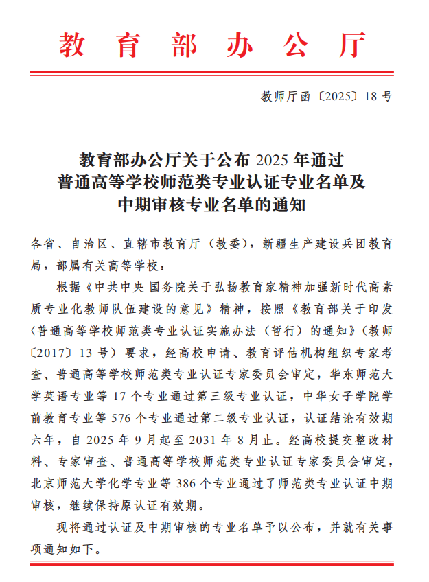 近日,教育部办公厅发布了《教育部办公厅关于公布2025年通过普通高等学校师范类专业认证专业名单及中期审核专业名单的通知》(教师厅函〔2025〕18号)。我校地理科学、汉语言文学、体育教育、美术学四个专业,经学校申请、学校自评、教育评估机构组织专家考查、普通高等学校师范类专业认证专家委员会审定等程序,通过了第二级专业认证,认证结论有效期为六年。