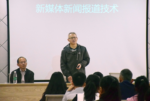 在提问环节,几位新闻培训班的同学与姜月平老师进行了交流互动。当问到在新媒体的冲击下,传统媒体是否会面临消失的危险时,姜月平说道:“作为一个从传统媒体向新媒体转型的新闻工作者,在转型的过程中,他也必须付出更多的时间和精力。”他认为,就像广播和电视,传统媒体和新媒体也将出于长期共存的状态。讲座结束后,此次主讲人姜月平老师和新闻培训班全体学员合影留念。