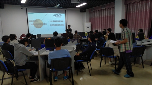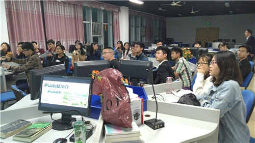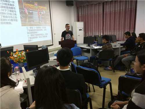 视频放映结束后,主持人请主讲嘉宾王智超上台演讲。王智超同学先是简单说了一下自己对九江的缘分,继而谈到了自己去庐山的五次经历,每场经历都吸引着同学们的仔细聆听,当然其中也夹带些许幽默与欢笑。在谈完五次庐山行之后,王智超同学也对比了一下南京林森别墅和总统府子超楼、天津近代建筑、大连近代建筑和山东青岛的近代建筑与庐山别墅群的一些异同点。在结束完自己的演讲后,王智超还特意拿出自己印刷的《王智超个人诗词精选—庐山别墅主题读书座谈会留念》赠与在场同学,受到了同学们的热烈鼓掌。