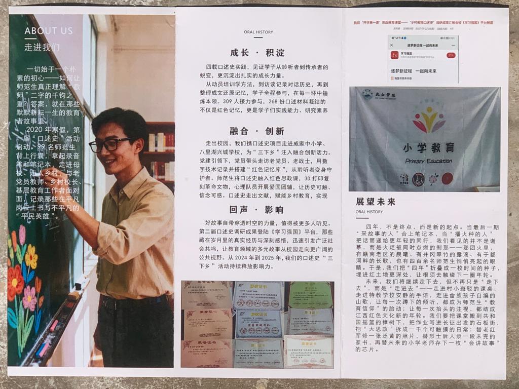 本次展览中,教育学院口述史项目团队精心制作的海报与宣传彩页吸引了众多与会者的目光。海报以“寻找身边的平民英雄——教师”为标题,背景为一支巨型粉笔画出的道路意象,画面下方是一位教师行走于路上的背影,面朝远方,象征着教育工作者默默耕耘、引领未来的精神。宣传彩页则系统介绍了项目的发起背景、实施过程和育人成效。